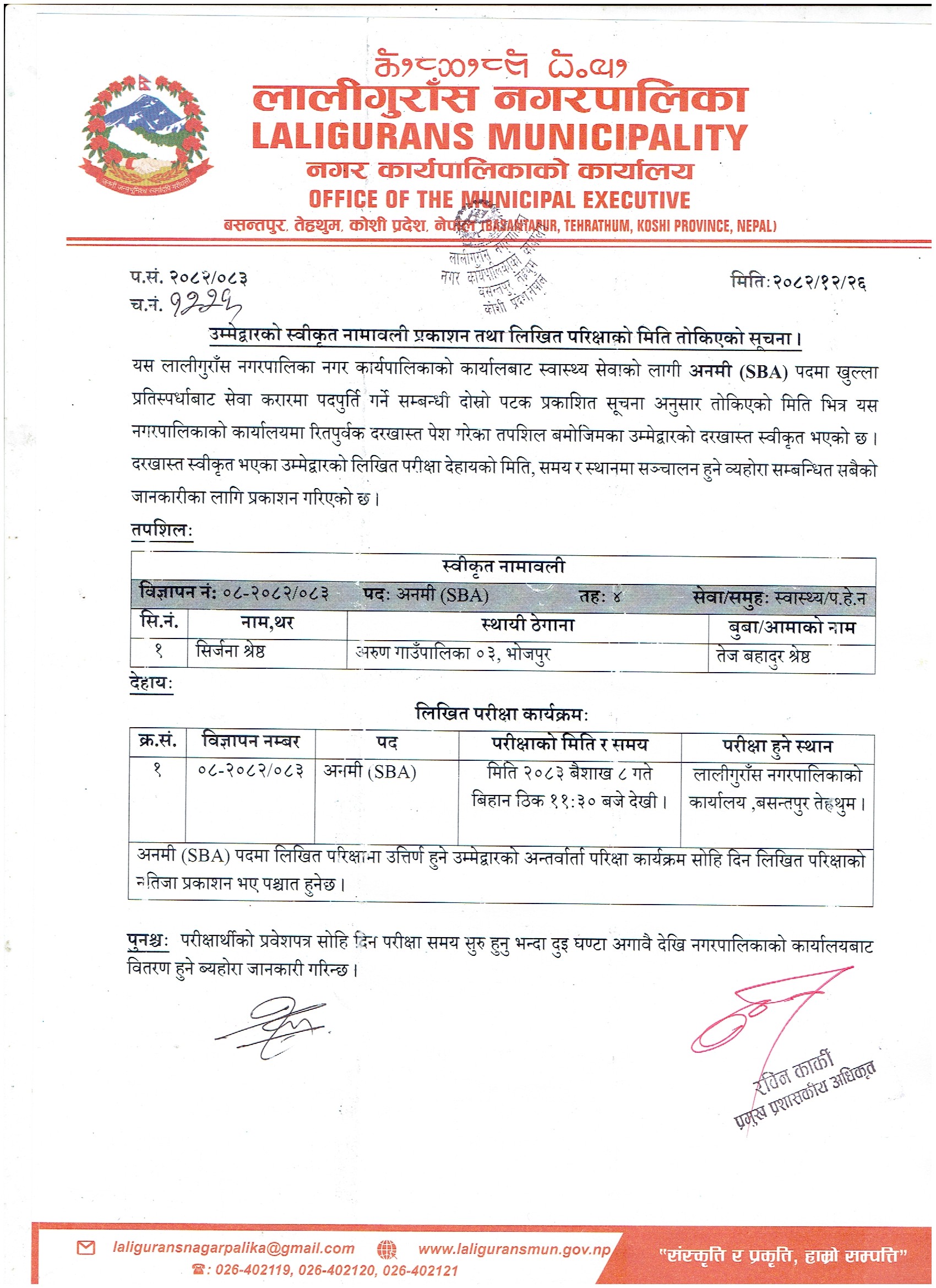 उम्मेद्वारको स्वीकृत नामावली प्रकाशन तथा लिखित परिक्षाको मिति तोकिएको सूचना ।