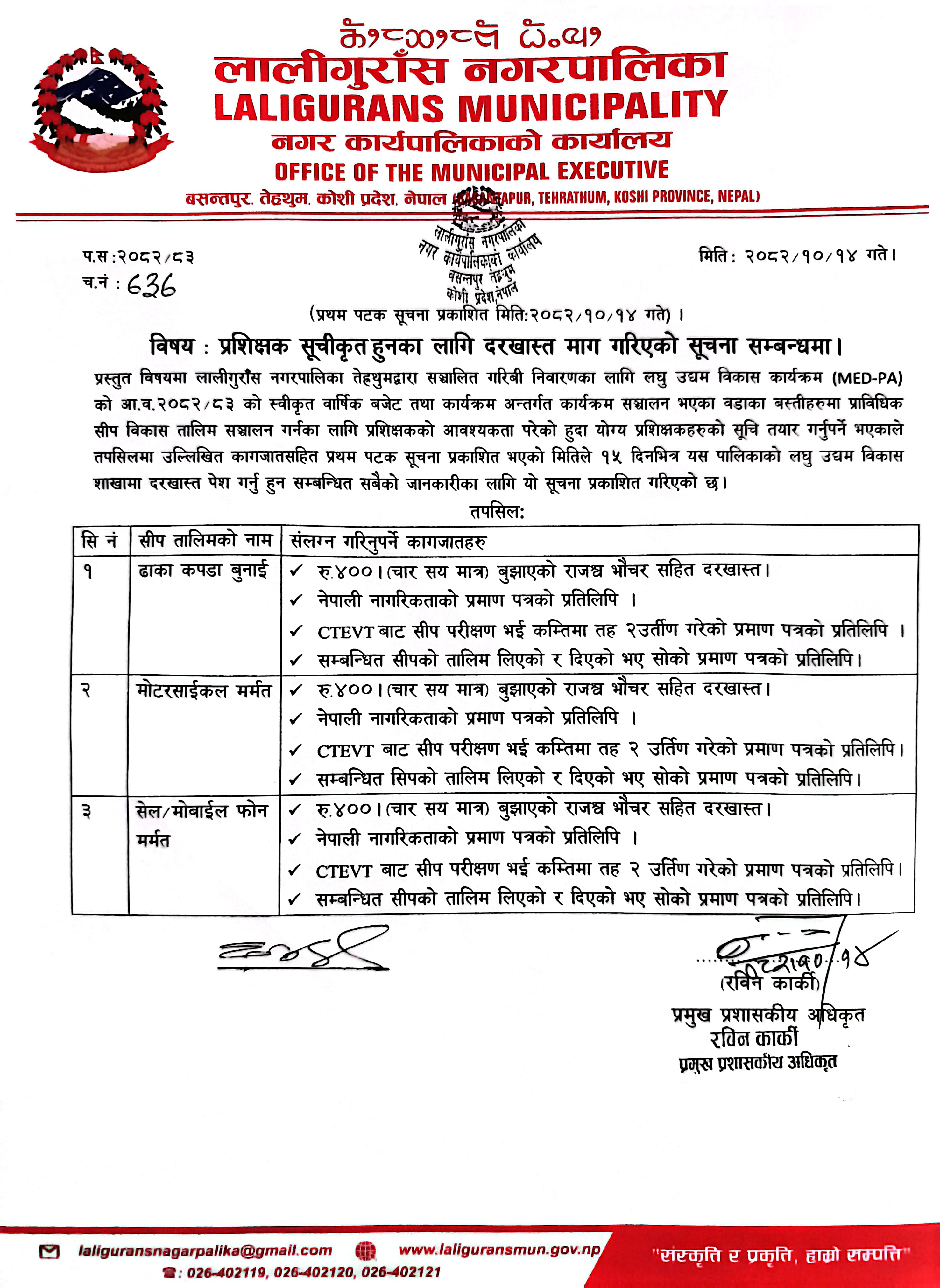 प्रशिक्षक सूचिकृत हुनका लागि दरखास्त माग गरिएको सूचना।