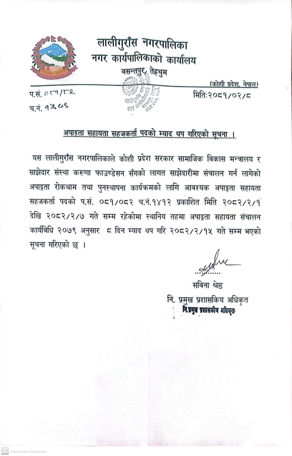 अपाङ्गता सहायता सहजकर्ता पदको आवेदन म्याद थप गरिएको सूचना ।