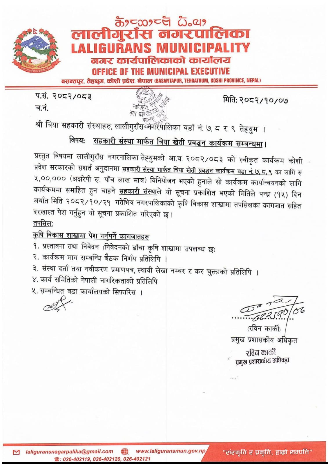चिया खेति प्रवर्धन कार्यक्रम सम्बन्धी सूचना ।
