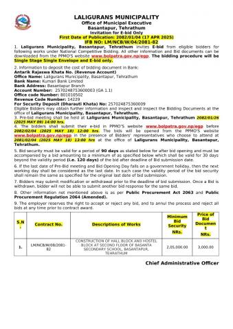 Invitation for E-bid Only (CONSTRUCTION OF HALL BLOCK AND HOSTEL BLOCK AT SECOND FLOOR OF BASANTA SECONDARY SCHOOL, BASANTAPUR, TEHRATHUM)