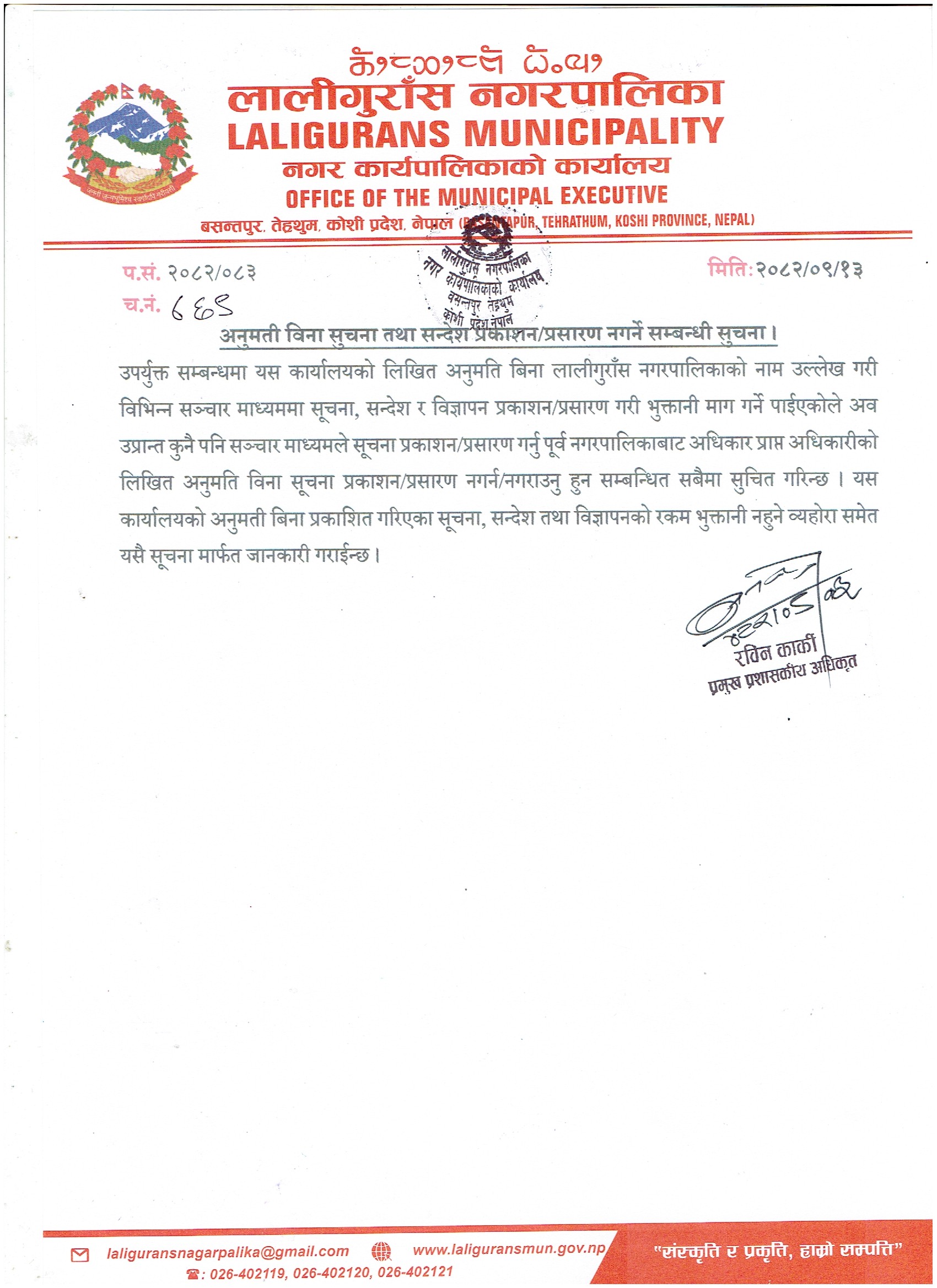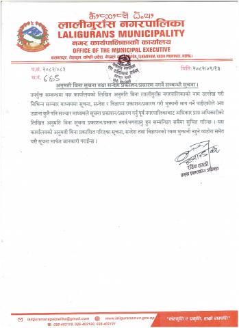 अनुमती विना सुचना तथा सन्देश प्रकाशन/प्रसारण नगर्ने सम्बन्धी सुचना ।