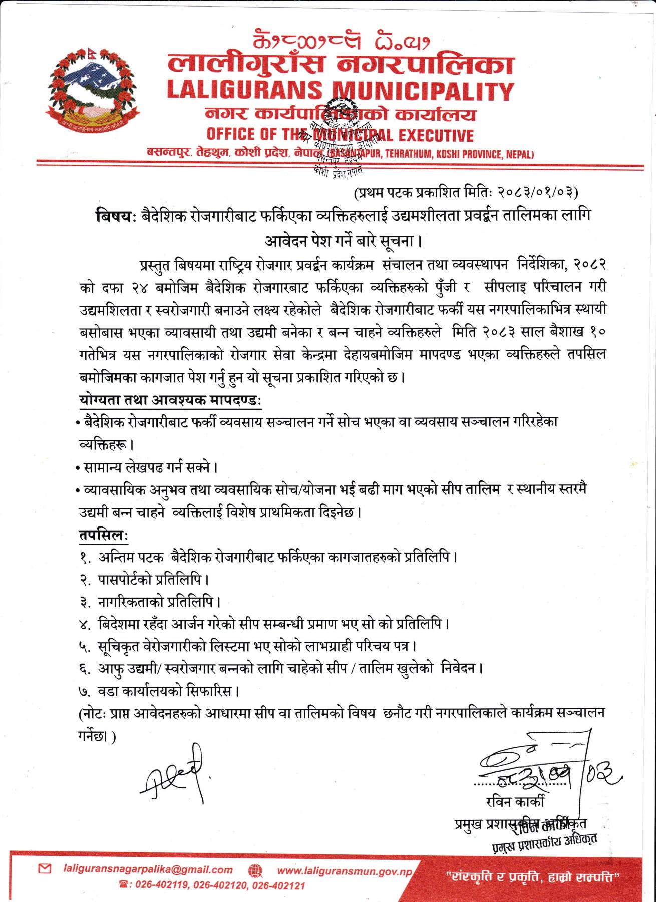 बैदेशिक रोजगारीबाट फर्किएका व्यक्तिहरुलाई उद्यमशीलता प्रवर्द्धन तालिमका लागि आवेदन पेश गर्ने बारे सूचना ।